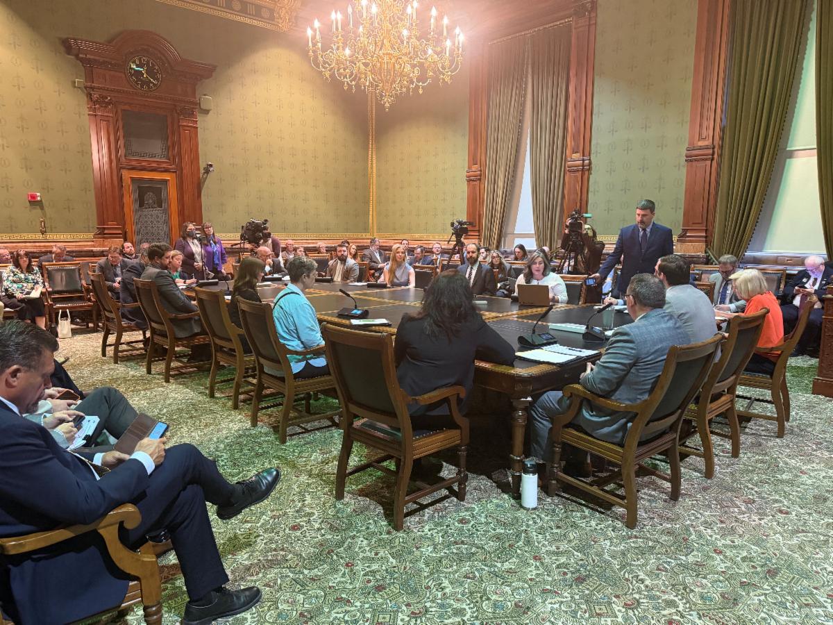 April 20, 2026: Stakeholders testify on the Senate GOP property tax proposal as members of the media and other attendees look on.